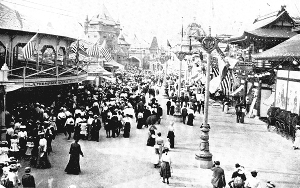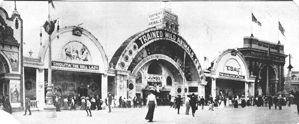 A glimpse of the MIDWAY from INDIAN CONGRESS. SCENIC RAILWAY to the lef
